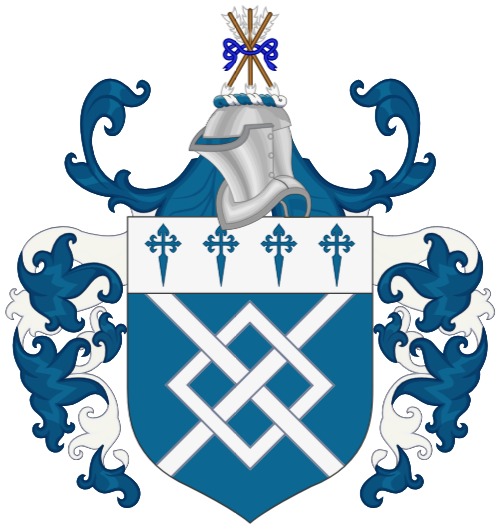 Escutcheon: Azure, a fret Argent; on a chief Argent four crosses of Saint James Azure.